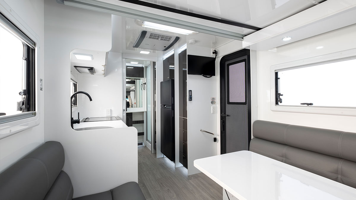 Single-piece composite panel construction on the floor, roof, and walls provides durability, stability, and lightweight properties for a smooth and comfortable journey.