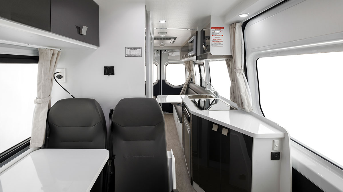 A forward-facing dinette features twin seats and a table for meals on-the-go, plus both seats feature ADR-approved seatbelts for additional day-tripping guests.