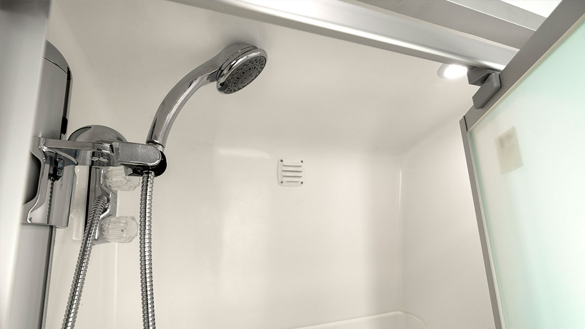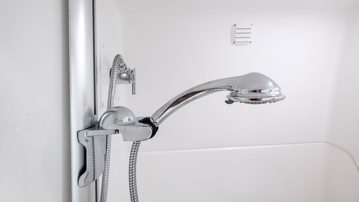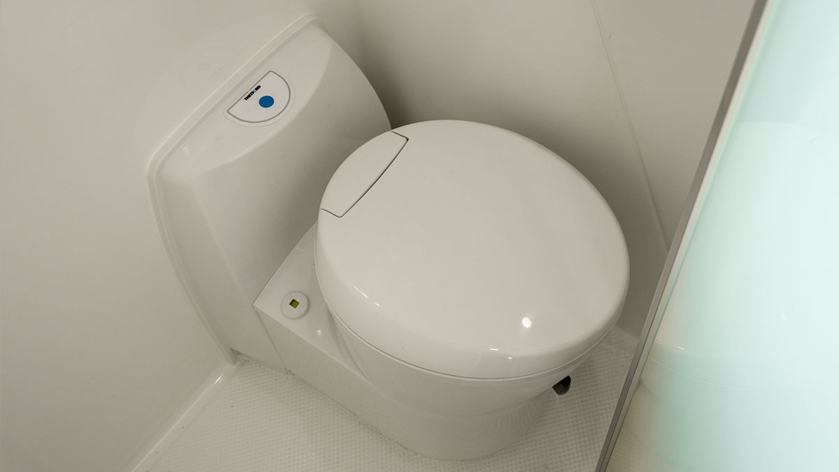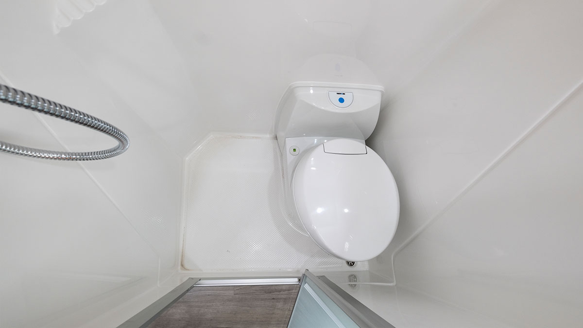 A combined shower/toilet offers convenience and saves space. The toilet has an electric flush, and the shower is a fully enclosed one-piece fibreglass construction.