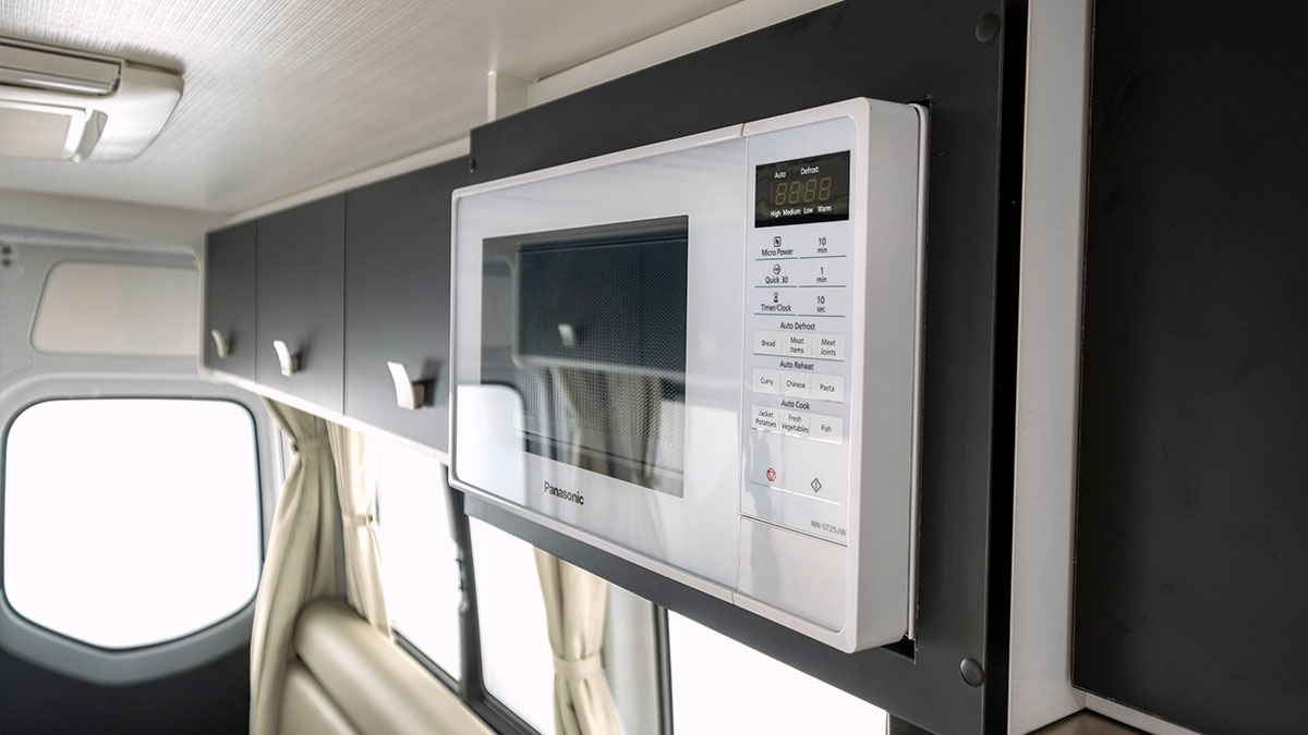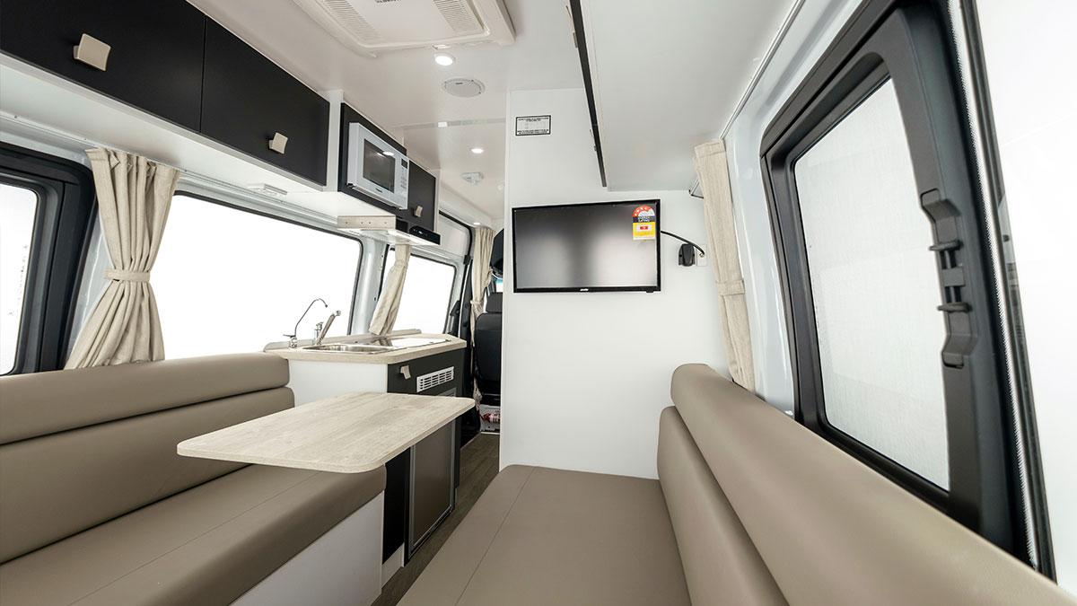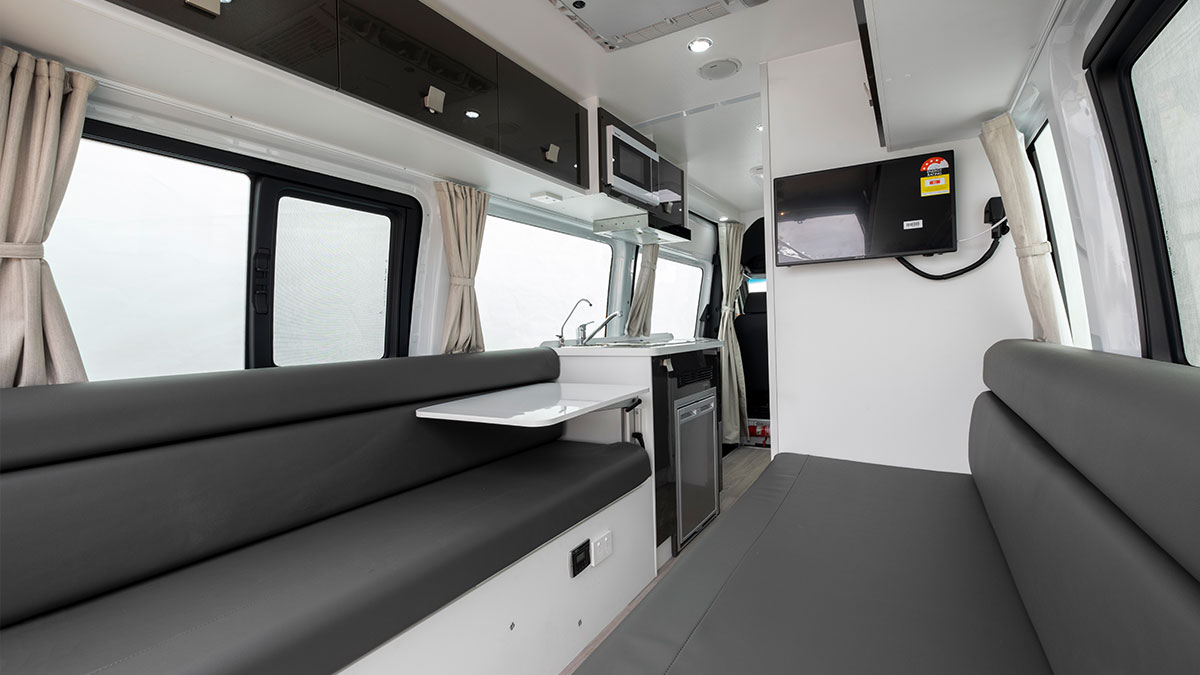 Added lifestyle luxuries include air conditioning, a stereo, speakers, an HD DVD/Multimedia TV, a 180W solar panel, a reversing camera, and a 4-metre exterior awning.