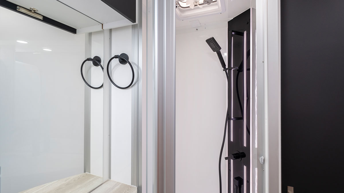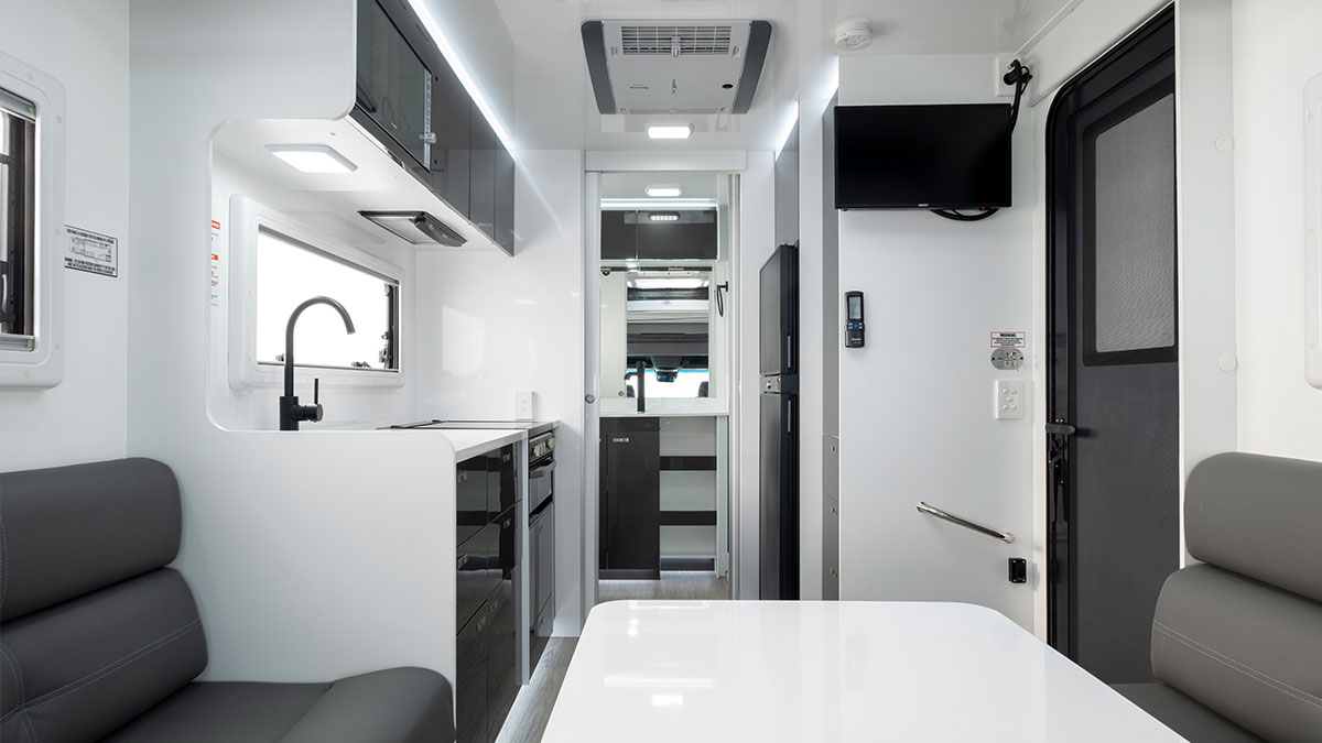 Single-piece composite panel construction on the floor, roof, and walls provides durability, stability, and lightweight properties for a smooth and comfortable journey.