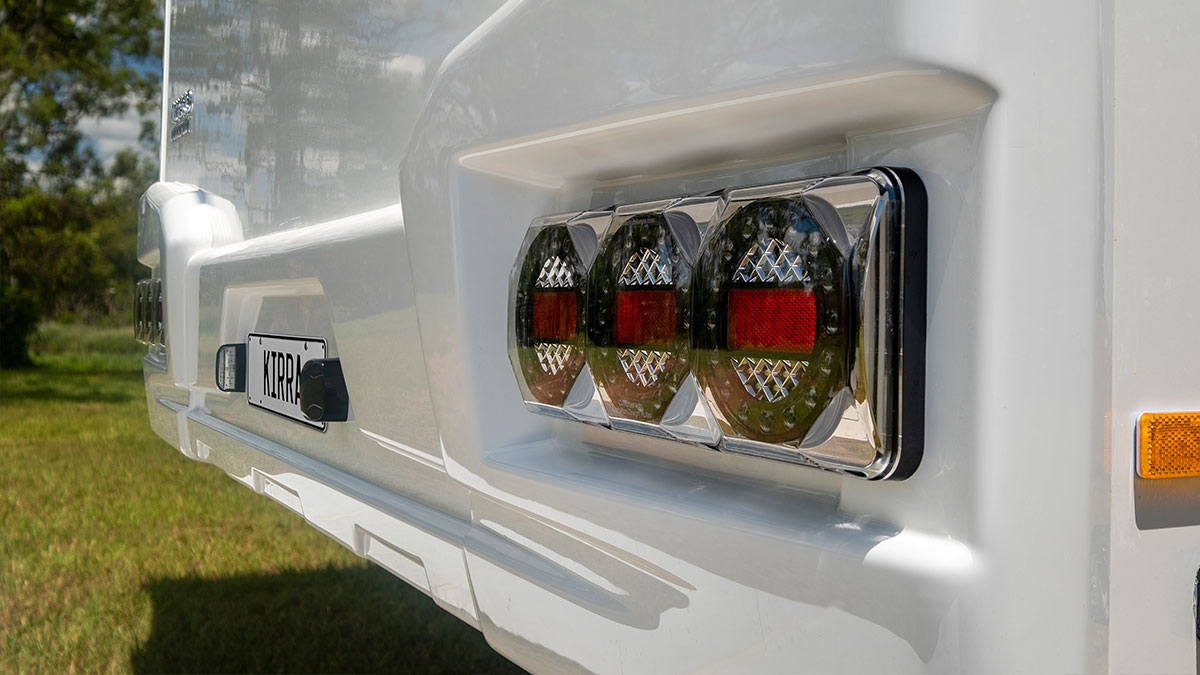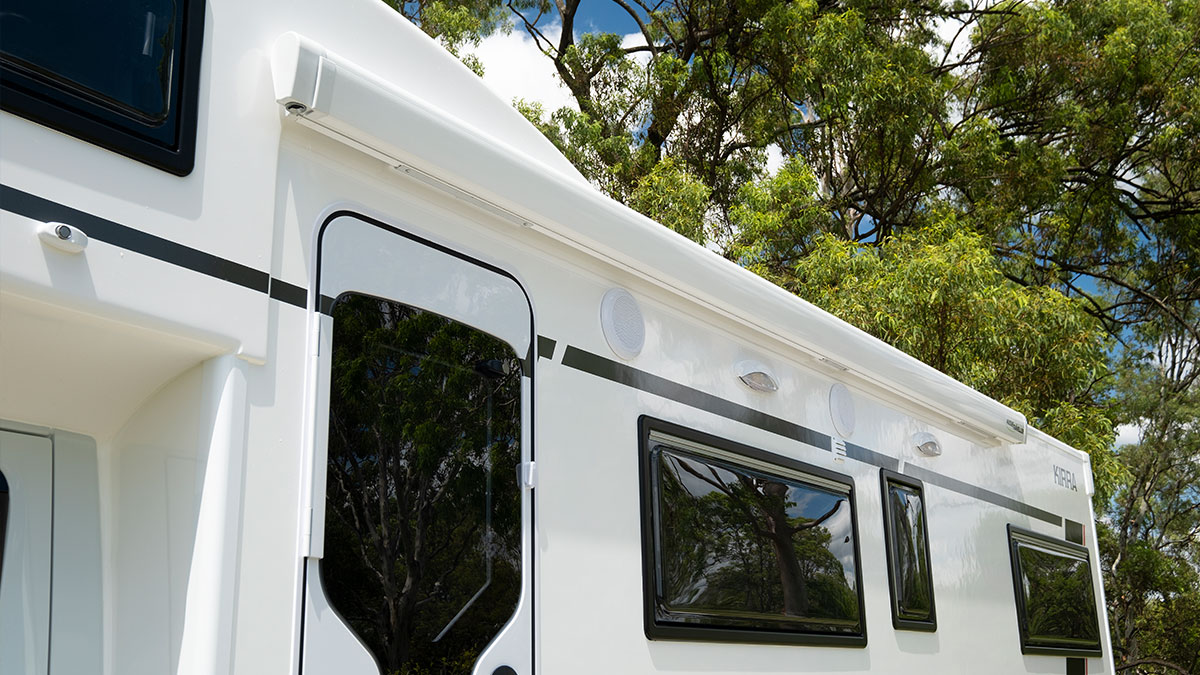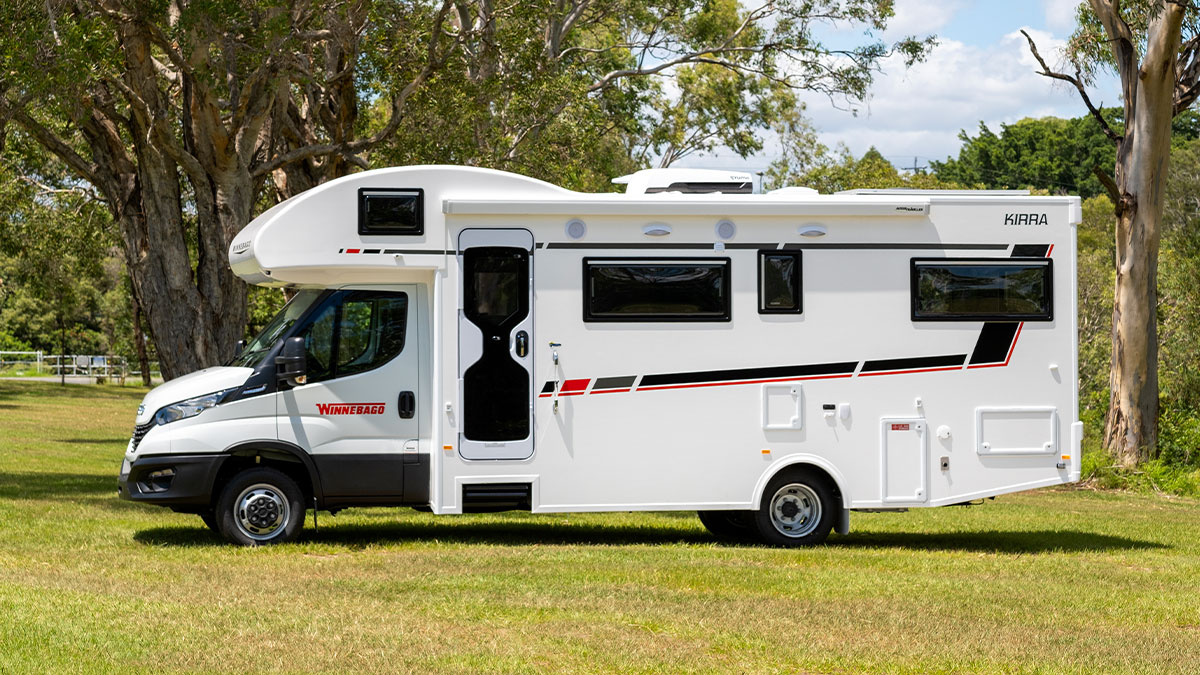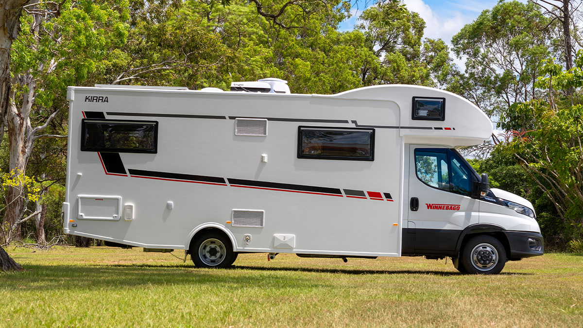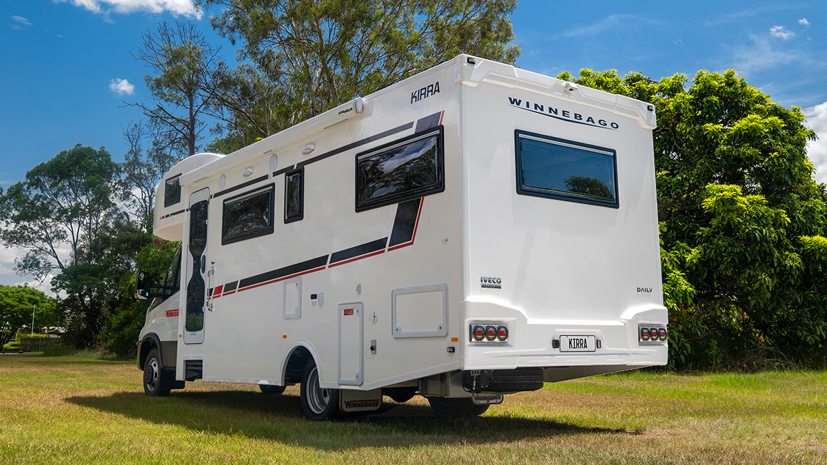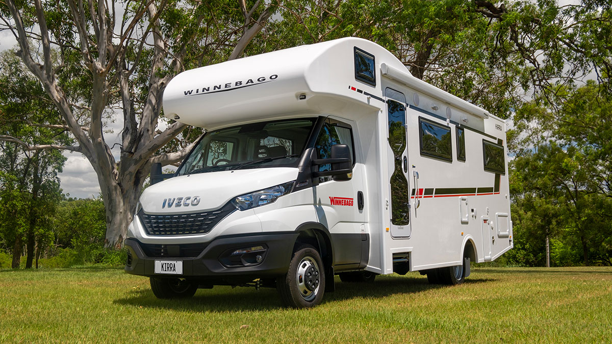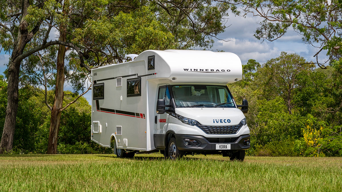The Kirra Winnebago is built on a robust IVECO Daily 50 chassis, features gel-coated interior and exterior walls for insulation, and is constructed with lightweight composite panels.