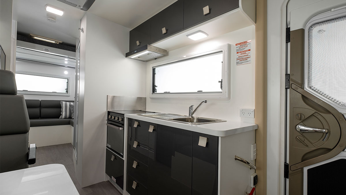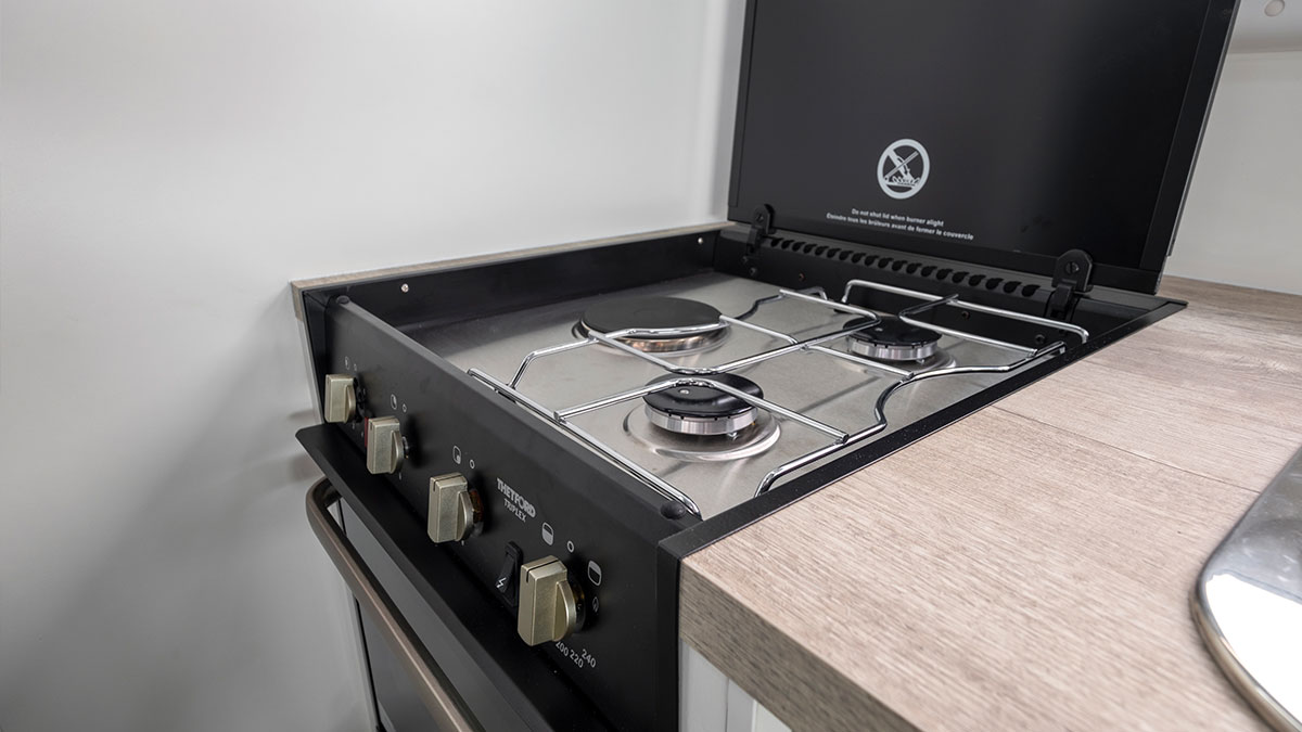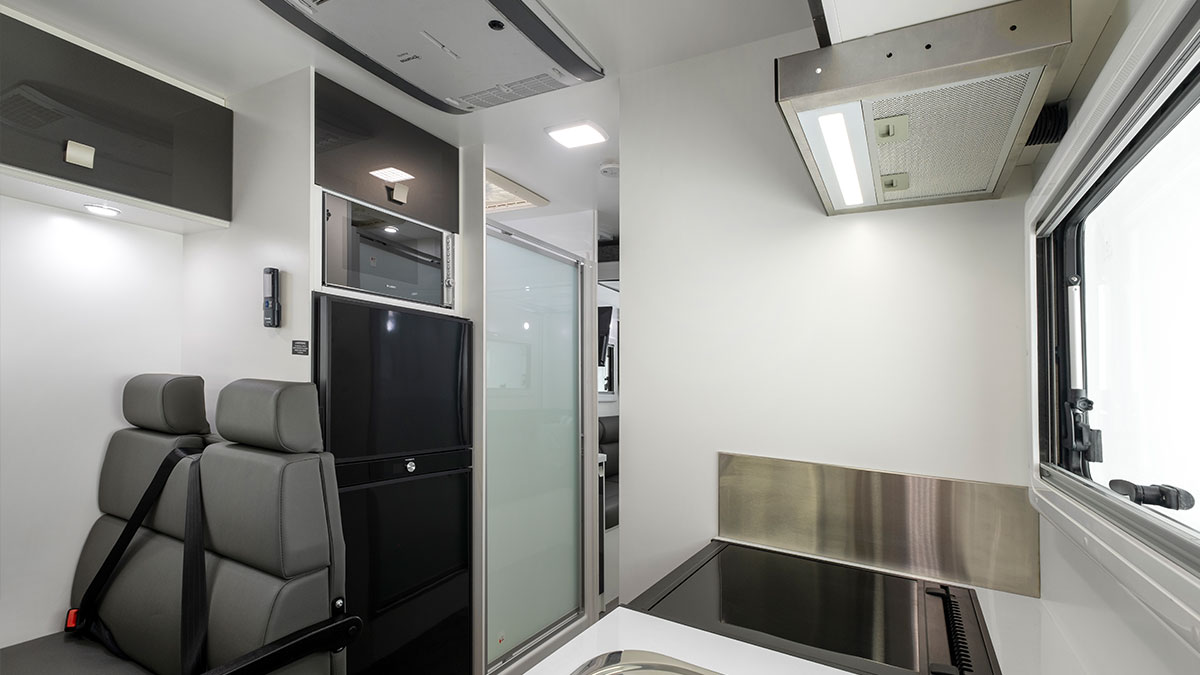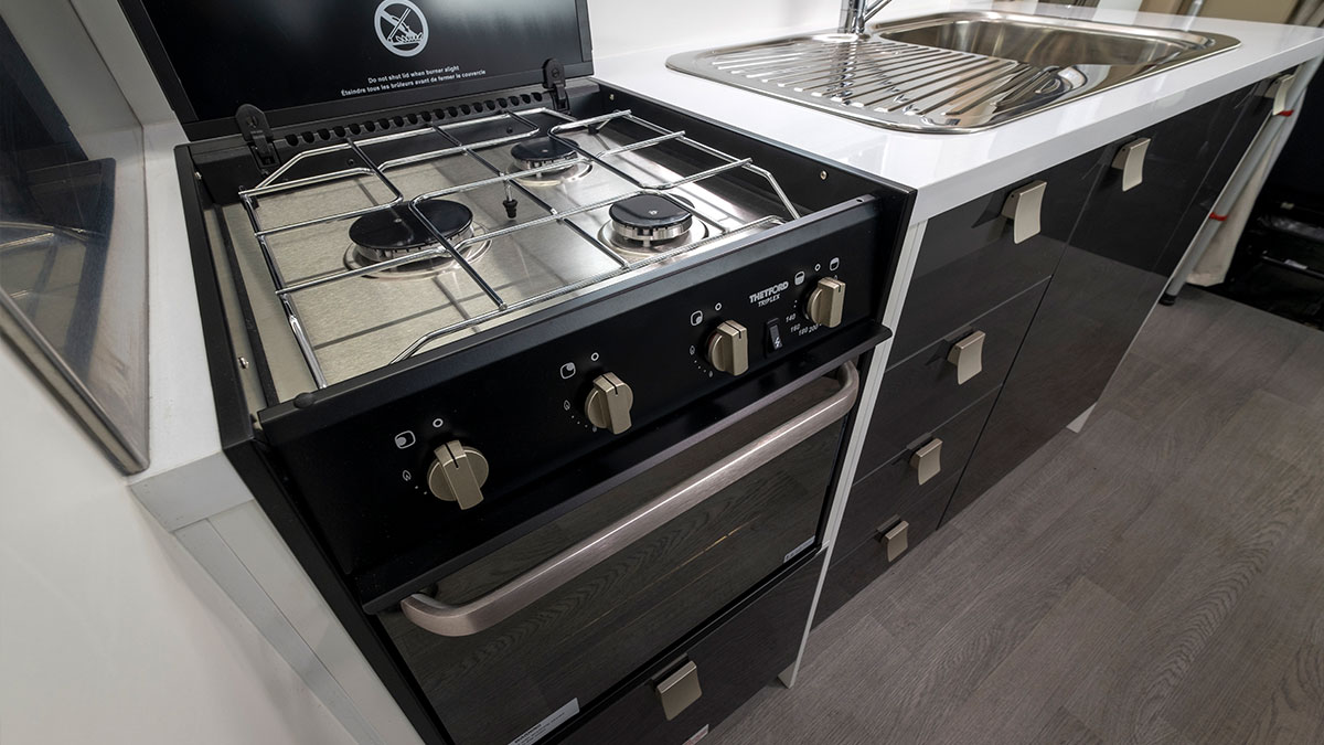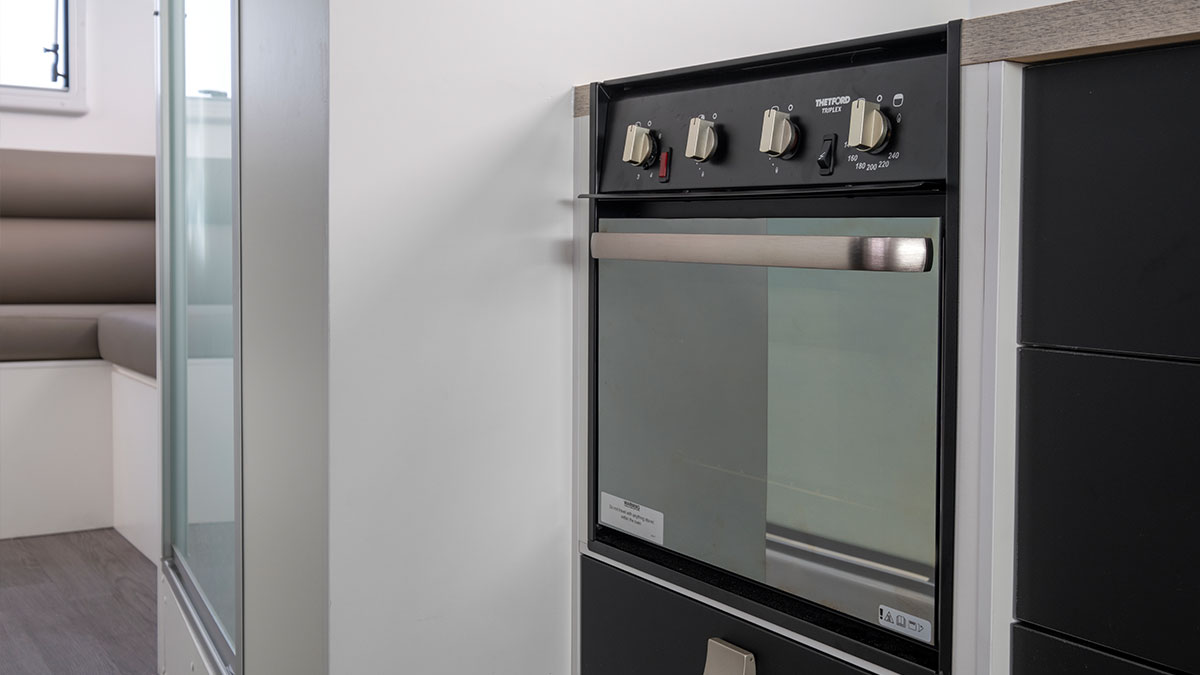 Being on-road doesn't mean you need to be off your favourite meals. The well-equipped kitchen features a cooktop with a grill and oven, a refrigerator, a microwave, and ample storage space.