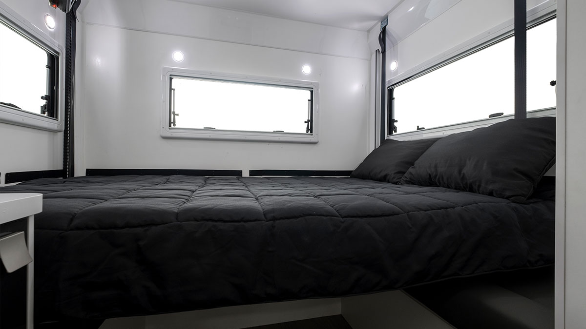 Enhanced extras include air conditioning, a reversing camera, a 180W solar panel, a stereo with Bluetooth connectivity, an external awning and shower, and two 90-litre water tanks.