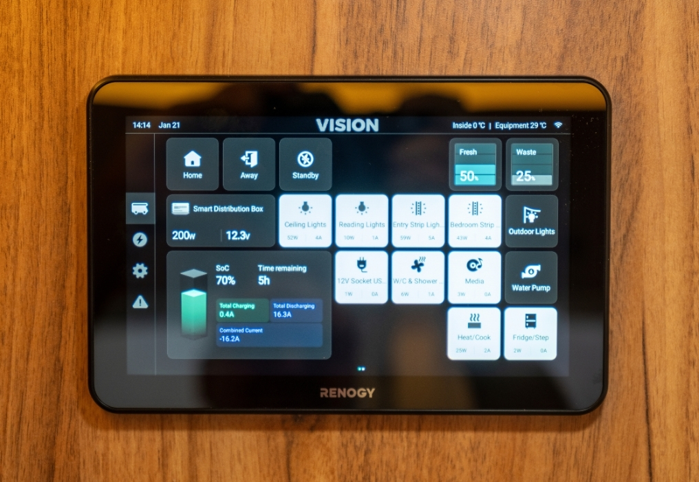 - Smart control panel monitors power and water via a custom Winnebago interface.