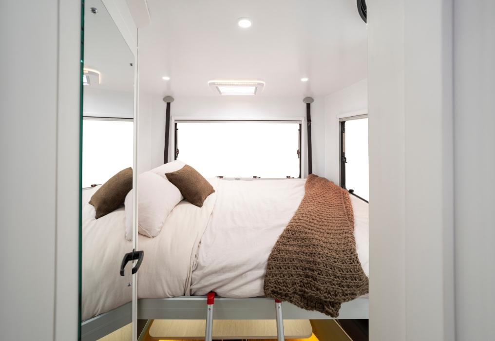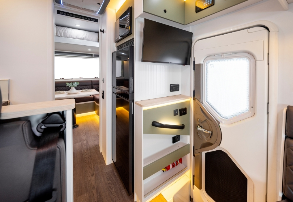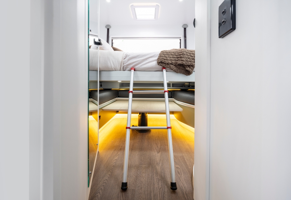 Enjoy expansive, light-filled interiors by day in the elegant club lounge, enhanced by ambient lighting that sets a refined, inviting mood. At night, a touch of a button lowers the electric queen bed, creating a serene, hotel-like retreat for effortless, restorative sleep.